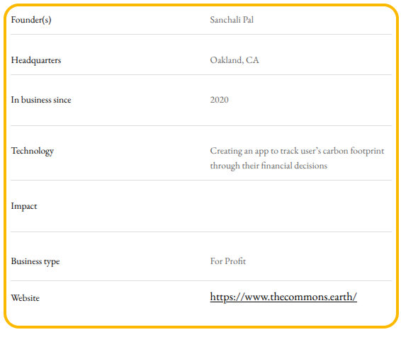 Founder Sanchali Pal was frustrated that she couldn’t find tools that made it easy to track and reduce her carbon footprint. While she was a senior at Princeton University, a combination of an economics background and watching the documentary Food, Inc. sparked her interest in how everyday choices—especially around food and spending—impact the climate. Over many years she manually tracked her carbon emissions in a spreadsheet, cut her own emissions by about 30%, saved money, and realized that understanding the climate impact of daily decisions could be both empowering for everyone. Commons was born from the insight that managing one’s carbon footprint could be as easy as tracking one’s finances. (Source)