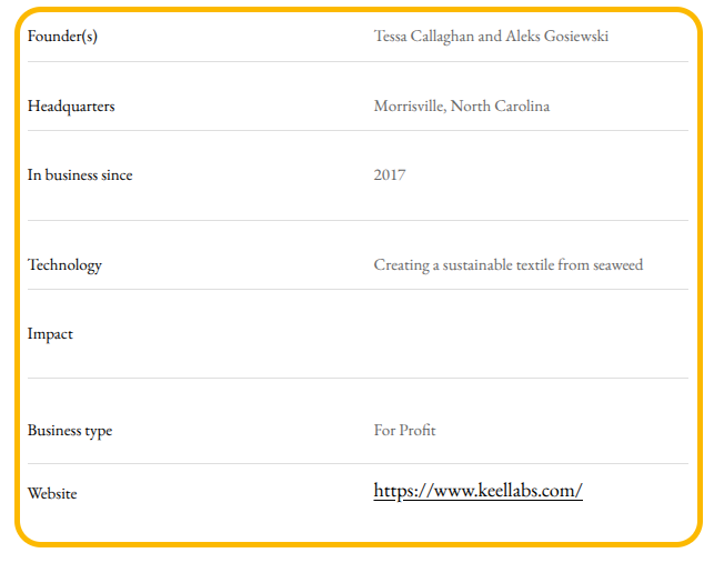 Keel Labs was originally founded in 2017 by Tessa Callaghan and Aleks Gosiewski while they were students at the Fashion Institute of Technology, Their collaboration started as a student project focused on transforming seaweed into textile fibers, which quickly gained momentum and evolved into the startup AlgiKnit, later rebranded as Keel Labs. (Source)