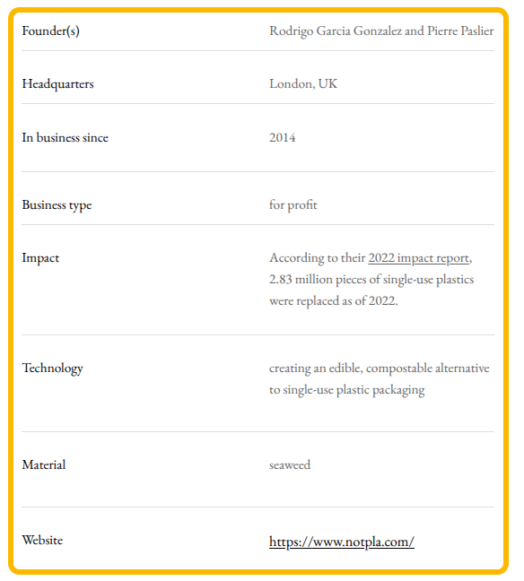 Co-founders Rodrigo Garcia Gonzalez and Pierre Paslier met while studying Innovation Design Engineering at Imperial College London and the Royal College of Art. They were inspired by the idea of mimicking nature’s packaging, like fruit peels and developed the idea together. Their first video of edible bubble encapsulating water went viral, and they collaborated with chemists and chemical engineers to develop Ooho. They founded the company soon after. The company partnered with Lucozade to replace single-use plastic cups at the London marathon. (Source)