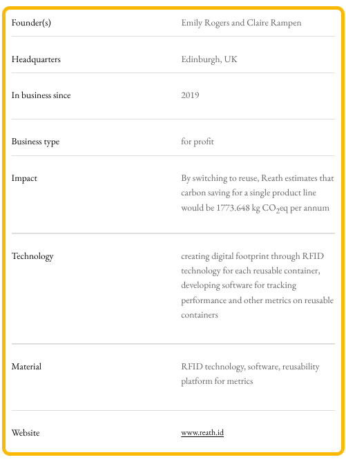 Co-founders Emily Rogers and Claire Rampen both had experience in tech before coming together to found Reath. Rogers had a background in inventory management and data management and Rampen had experience at a bike-share startup. They were both frustrated by their limited options for reducing the amount of single-use packaging they consumers, and were dismayed by the fact that even most recyclables are in fact incinerated. Together, they set out to make reusables a more appealing alternative for brands to consider by eliminating the obvious pain points. When they interviewed over 100 businesses they found the two main challenges. One, legislation around consumer goods requires a batch code for traceability in case there is a recall, which typically makes single-use containers more attractive for businesses. Second, they found that managing a circular system is a challenge when there is limited understanding of where all the packaging is in the system and how long consumers tend to hold onto a produce before sending it back. Also, taxation around packaging often encourages companies to prioritize a lower weight over durability. (Source) Reath was created to address all these challenges.