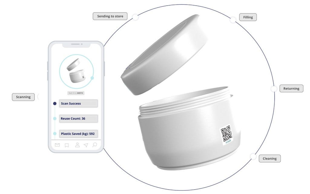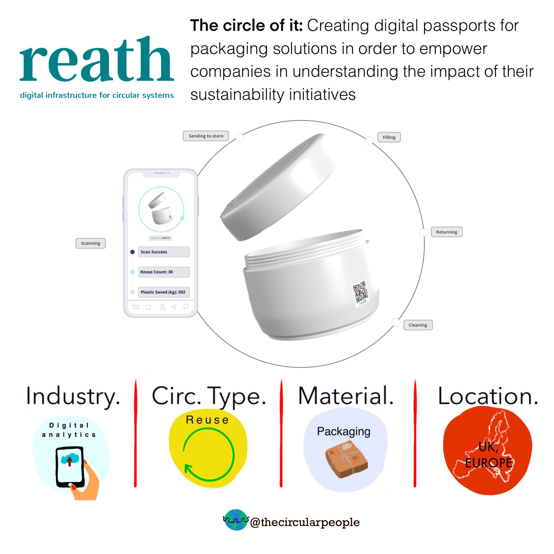 Reath works with brands — ranging from food and drink to cosmetics — to track their respective reusable pacakaging and also provides the brands with metrics about reusability. This data (e.g., how many times a container has been reused, how long it took for the container to be returned, etc.), can then be used to manage and grown reuse systems by customers of Reath. The company gives each item of reusable packaging a “digital passport,” which collects ‘stamps’ in as it is reused. These data-related incentives are designed to support and encourage reuse both by brands and consumers of the brands.